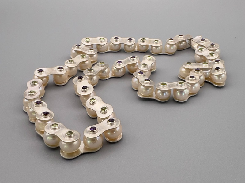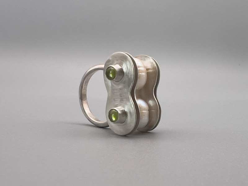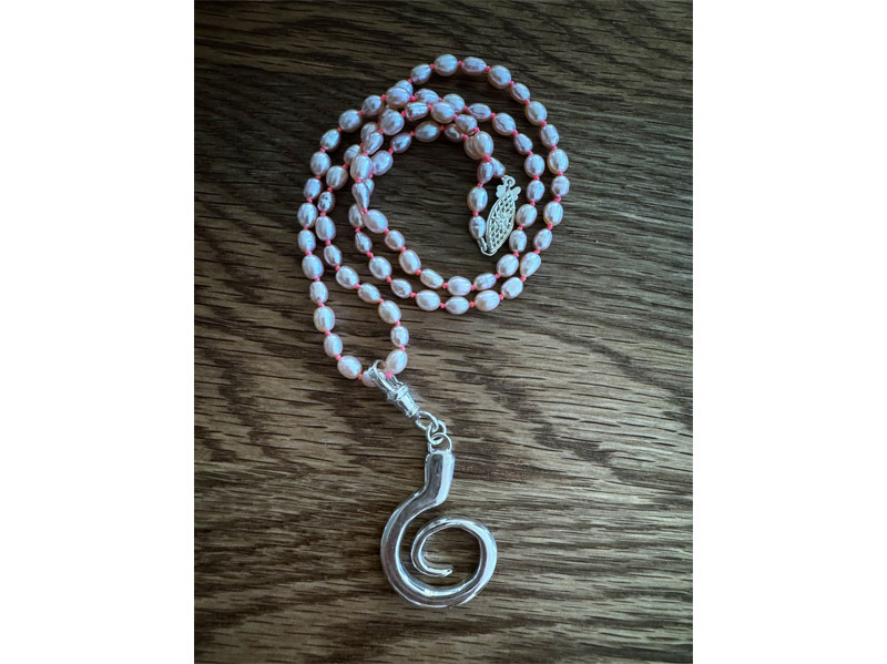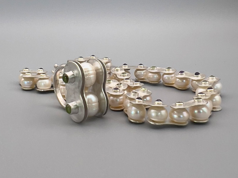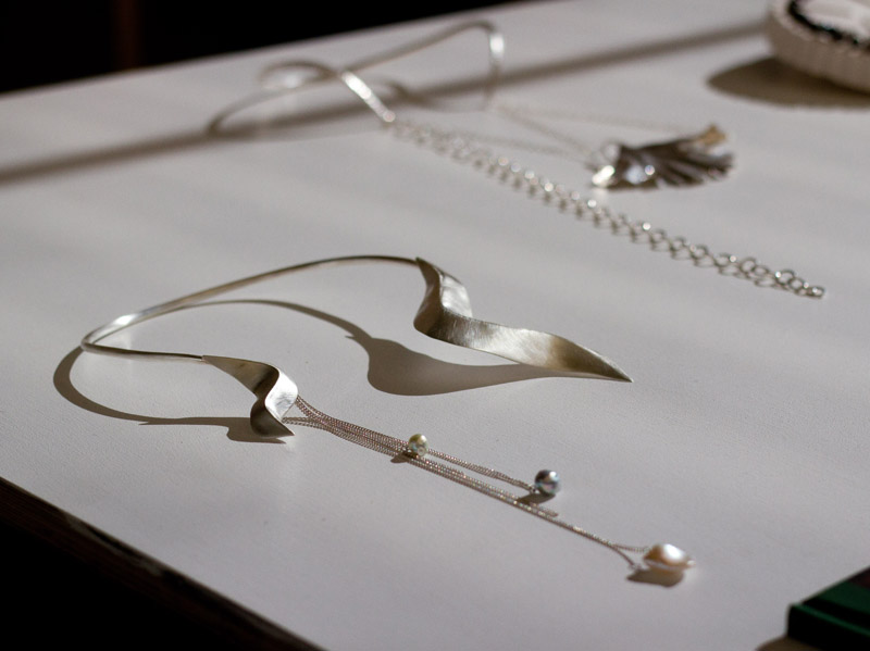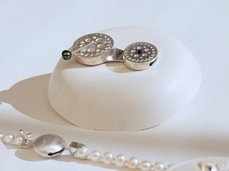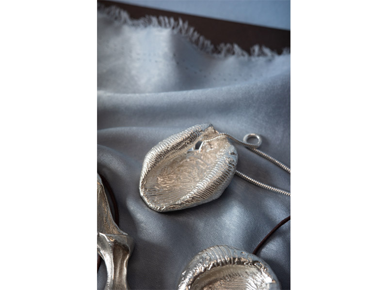 Research led to the discovery of ground parasites with beautiful shapes and textures and this was the main source of inspiration for the collection. Pearls are combined with silver which is then oxidised to create a darkened effect to highlight the textures and shapes.