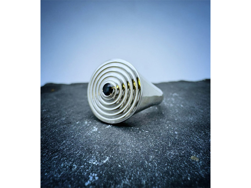 Jo’s collection pays homage to American minimalist and land artist Robert Smithson. Drawing on his landscape-scale sculptures of poured asphalt and mirrors, geology and crystals, she explores the technique of pouring molten silver onto wire rings, frames and stones.