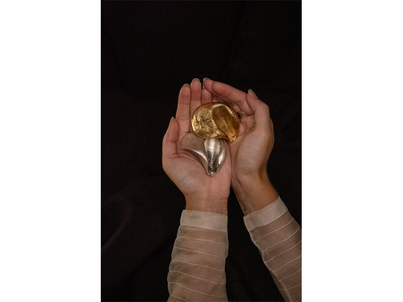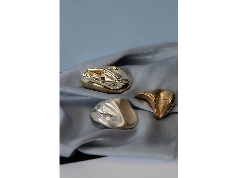 Naomi’s Faba jewellery collection draws inspiration from the humble bean. By hyper-focusing on the shape and form alone, the bean has been reworked, remodelled and recontextualised using a broad range of different techniques and finishes in order to explore its relationship with space and play with the boundaries of its structural properties.