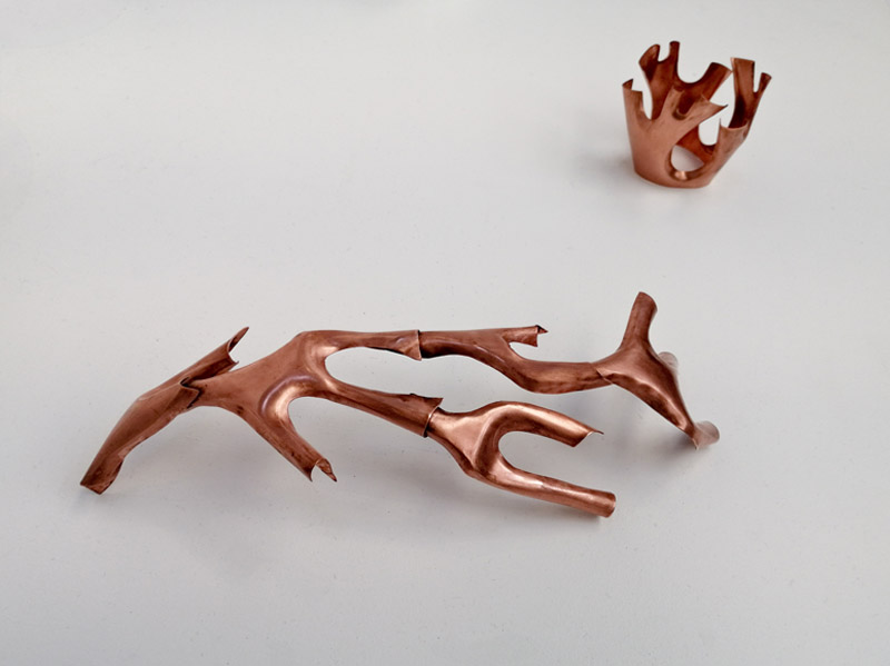 I am passionate about all forms of art and believe that jewellery is one of them and can transmit a concept. My first collection, Abandoned, is inspired by forsaken places, particularly industrial sites. I am fascinated by the transformation of things – how they change by being exposed to various factors when they are left aside. I focus especially on the transformation of metal and how it reacts while exposed to organic and chemical factors.