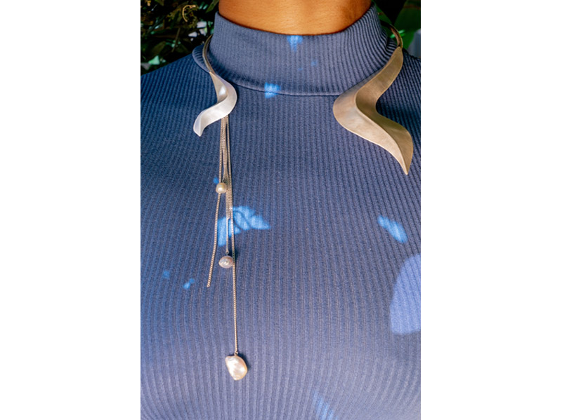 Her pieces can be worn on their own or as an ensemble and seek to distil the essence of waves that are always in motion and forever remaking themselves.